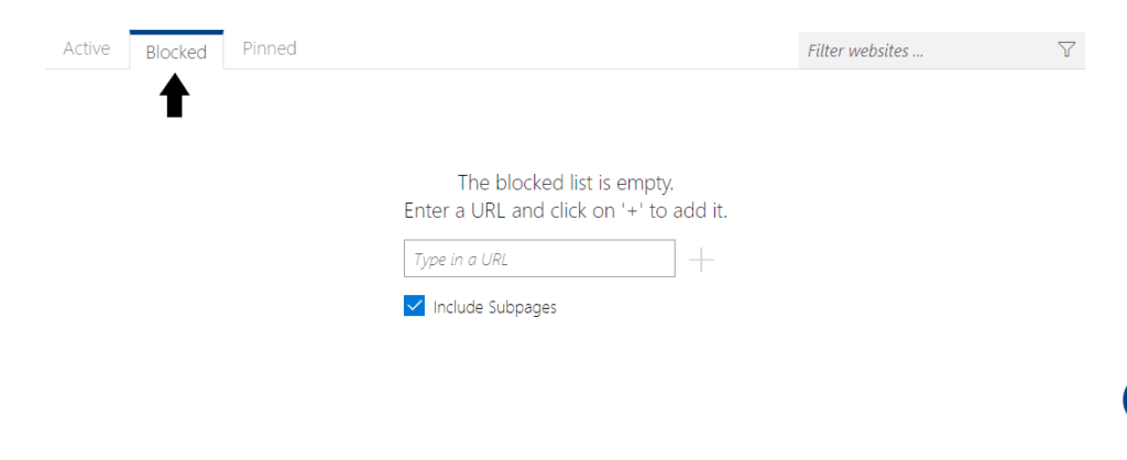 Pod záložkou Blocked [blokované] můžeme přidat URL odkazy stránek, u kterých nechceme, aby se zobrazovaly. Podstránky lze zablokovat také.