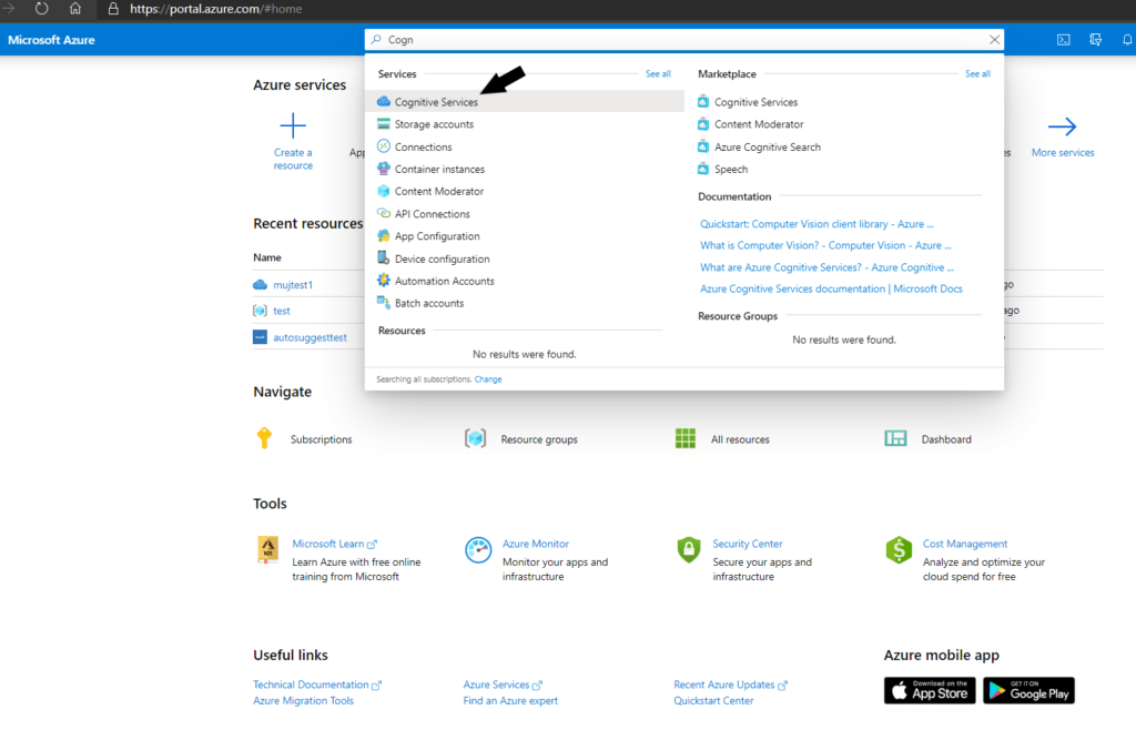 Nejprve se přihlásíme. Poté do vyhledávače zadáme Cognitive Services a klikneme na tlačítko Add [přidat].