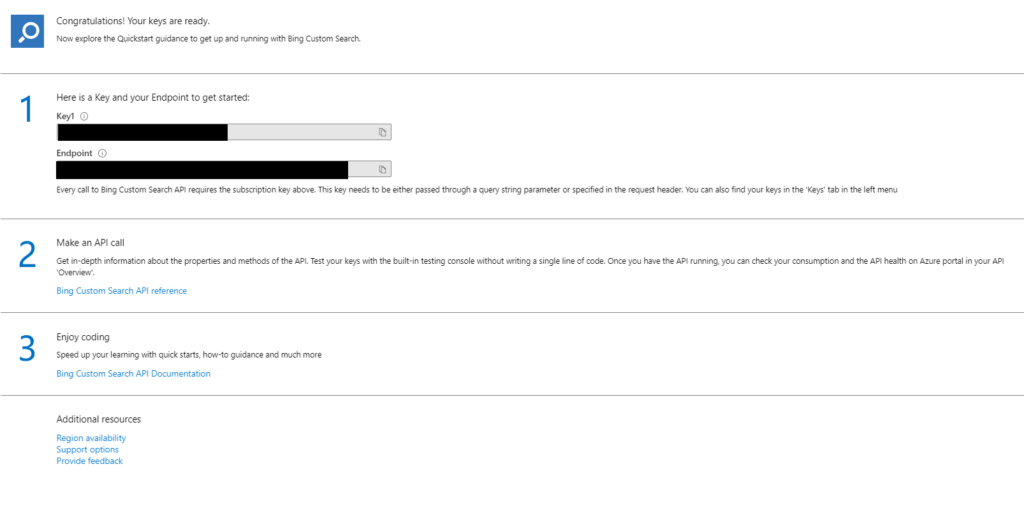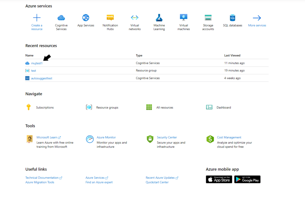 Klíče k Azure Web Search najdete na portal.azure.com v Recent resources [nedávné zdroje], kde vyberete službu, kterou jste si vytvořili. Klíč se vám po rozkliknutí zobrazí (je možné, že bude chvíli trvat, než se produkt aktivuje).