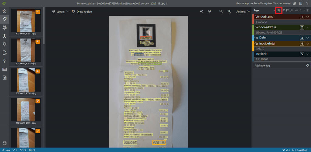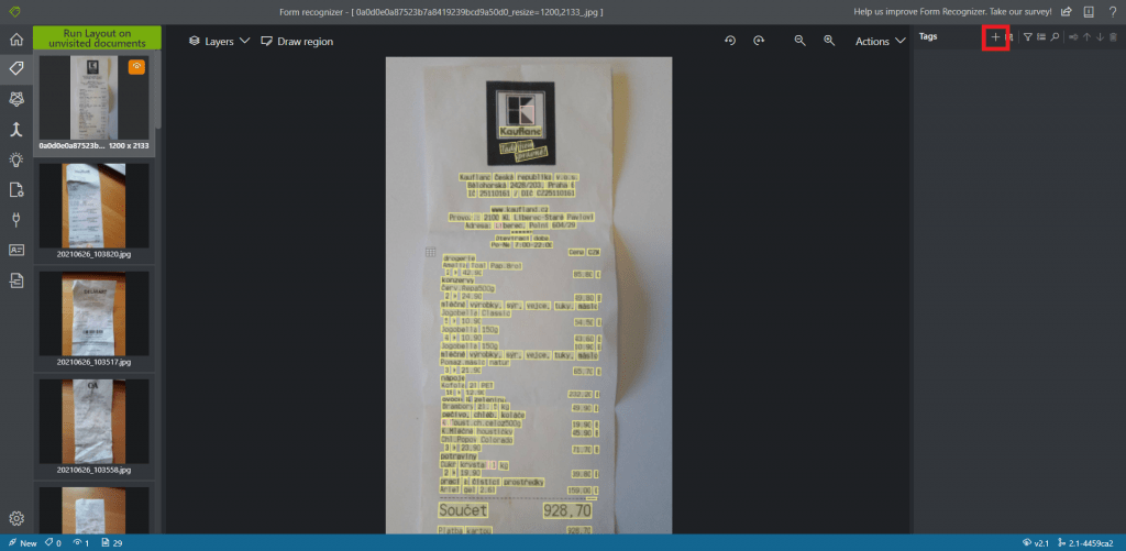 Abyste přidali text a hodnoty do tabulky, rozkliknete ji, označíte daný text, hodnoty, a vložíte ho do tabulky. Pokud máte všechen text a hodnoty v tabulce, klikněte na Done. Když už máte vytvořené všechny tagy a tabulky, kliknete na Actions a vyberete Run Layout on all documents. Všechny tagy a tabulky se vytvoří automaticky i na ostatních účtenkách, dokumentech. U ostatních účtenek, dokumentů přidáte stejně text a hodnoty k vytvořeným tagům.