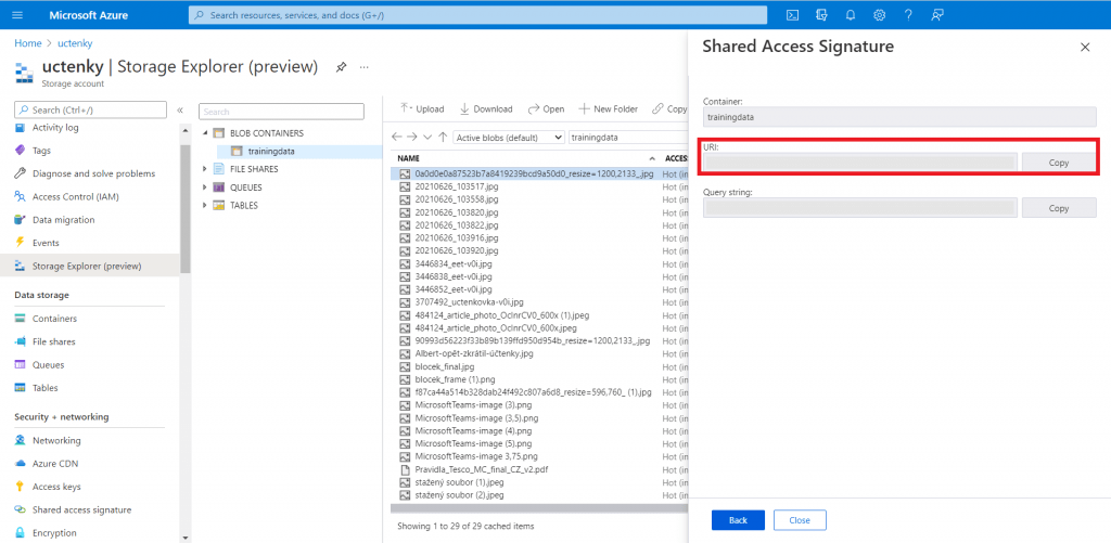 Dále rozkliknete nově vytvořený kontejner. Kliknete na Upload a vyberete vaši tréninkovou sadu dat, potom kliknete znovu na Upload.