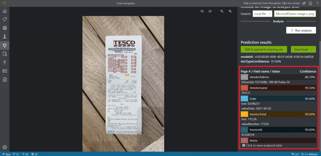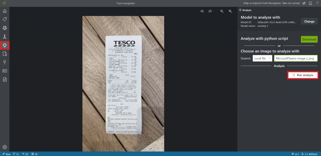 Pokud si chcete otestovat přesnost vašeho modelu, kliknete na ikonu Analyze, vyberete si model pro analýzu a vložte účtenku, dokument, na které chcete udělat analýzu. Nepoužívejte stejné účtenky, dokumenty, které máte v tréninkové sadě dat.