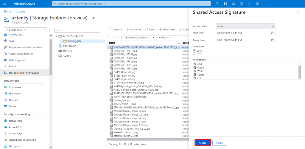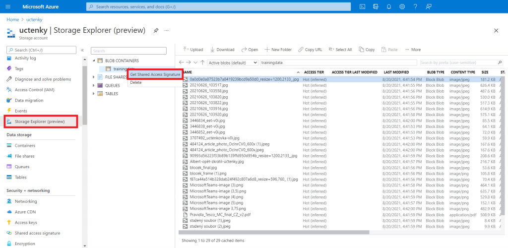 Na Azure portálu kliknete na váš Storage account, potom vyberete Storage Explorer. Rozkliknete Blob Containers, pravým tlačítkem kliknete na váš vytvořený kontejner a vyberete Get Shared Access Signature.