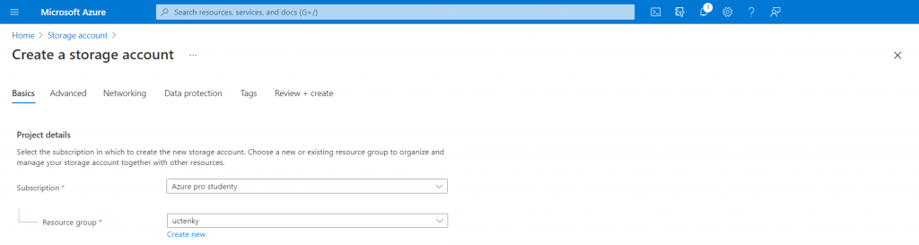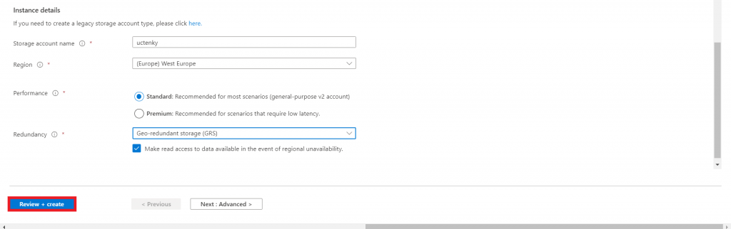 Doplníte potřebné údaje: vyberete si předplatné, zvolíte si Resource group, kterou jste před chvílí vytvořili, nejbližší lokalitu, standartní výkon a Geo-redundant storage. Potom kliknete na Review + create a znovu na tlačítko Go to resource.