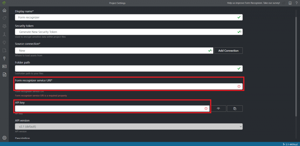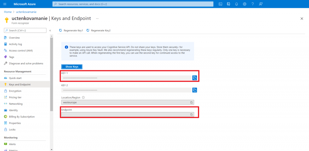 Potom klikněte na Home a na Use Custom to train model with labels and get key value pairs. Doplňte jméno projektu, vyberte připojení, které jsme před chvílí vytvořili, Folder path vyplňovat nemusíte. Potom potřebujete Form Recognizer service URI a API klíč. Vrátíte se znovu na Azure portál a kliknete na vytvořený Form Recognizer.