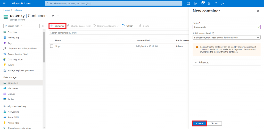 Když máte vytvořený Storage account, kliknete na Containers. Vytvoříte si nový kontejner, pojmenujete si ho jako Public access level, vyberete Blob a klinete na Create.
