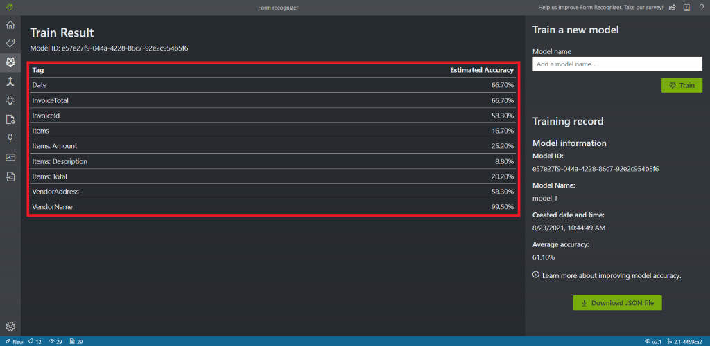 Chvíli počkejte a potom se vám ukáže přesnost vašeho modelu u daných tagů. Pokud chcete zvýšit přesnost modelu, musíte přidat a analyzovat další data.