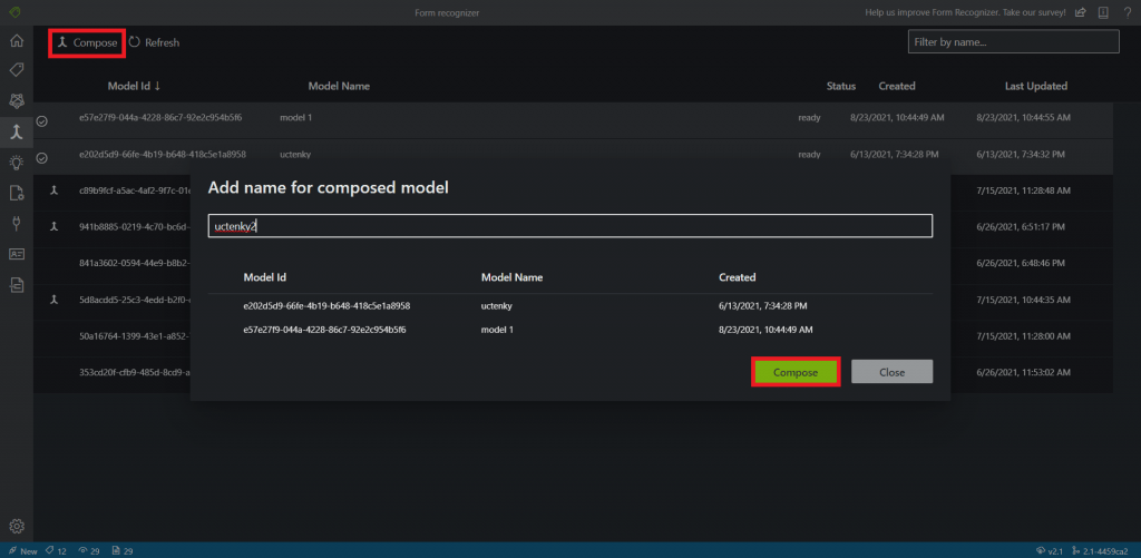 Lze také spojit modely dohromady, aby přesnost analýzy byla vyšší. Vyberete si minimálně dva modely a klikněte na Compose. Vytvoří se nový model, který si pojmenujete a kliknete na Compose.
