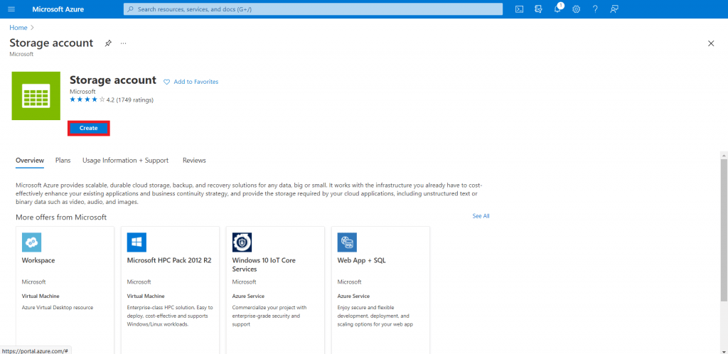 Dále potřebujete vytvořit Storage account. V Marketplace si vyhledejte Storage account a kliknete na Create.