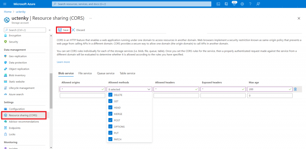 Nakonfigurujte sdílení prostředků mezi doménami na Azure Blob storage. Klikněte na Resource sharing (CORS) a doplňte tam následující hodnoty: