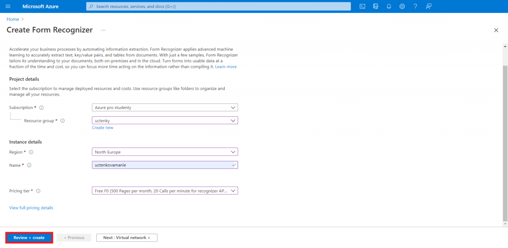 Dále pro docílení této AI vyplníte potřebné údaje: vyberete si předplatné, vytvoříte si novou Resource group, vyberete si lokaci nejbližší k vám a zvolíte si pricing tier F0. Potom kliknete na Review + create.