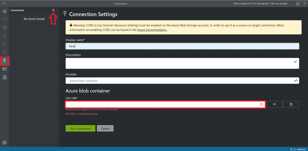 Na vytvoření a trénování vlastního modelu AI použijete Form Recognizer Sample Tool. Kliknete na Connections, na přidat Connections. Doplníte jméno, popis doplňovat nemusíte, u Provider necháte Azure blob container. Dále potřebujete SAS (Shared Access Signature) URI vašeho Azure Blob Storage kontejneru, proto se vrátíte na Azure portál.