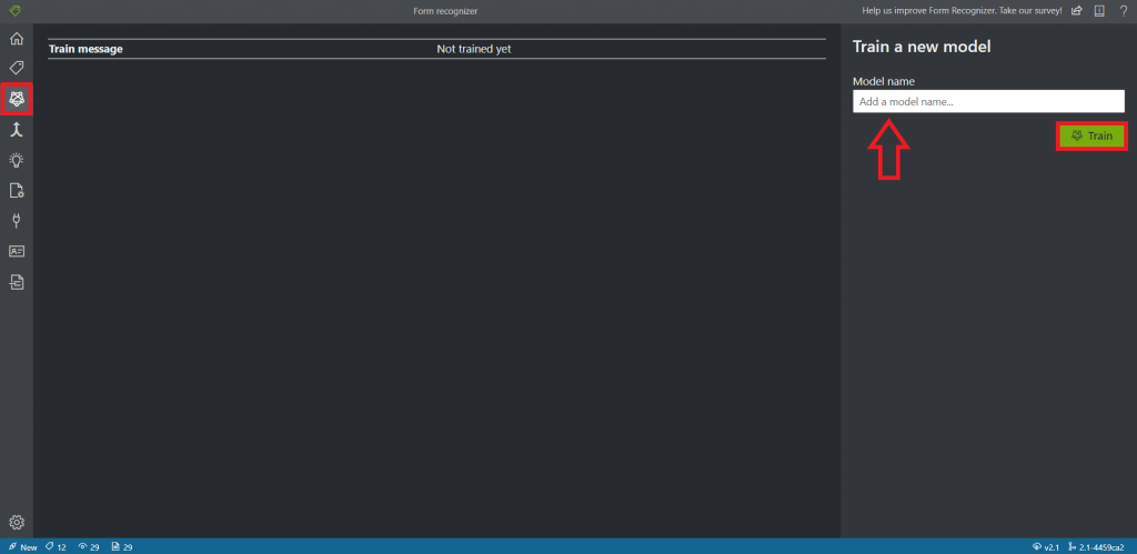 Když máte všechny hodnoty a text přiřazený, kliknete na ikonu Train. Zde si zvolíte název modelu a stisknete Train.