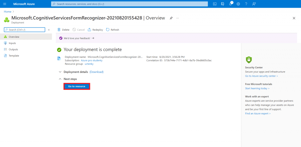 Kliknete na Go to resource a máte vytvořený Form Recognizer.