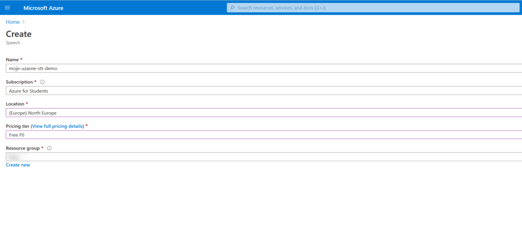 - Poté v sekci „Marketplace“ klikneme na „Speech to Text“ a vyplníme formulář, kde vybereme „Create new“. Jako lokaci vybereme tu nejbližší k nám - tou je „(Europe) North Europe“. Jako pricing tier vybereme F0 a resource group si vytvoříme novou.