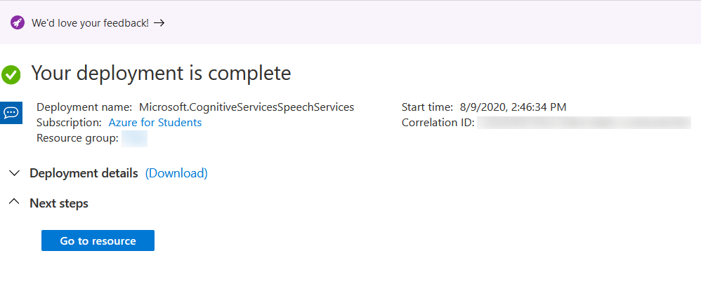 - Jakmile se nám projekt vytvoří, vybereme „Go to Resource“.