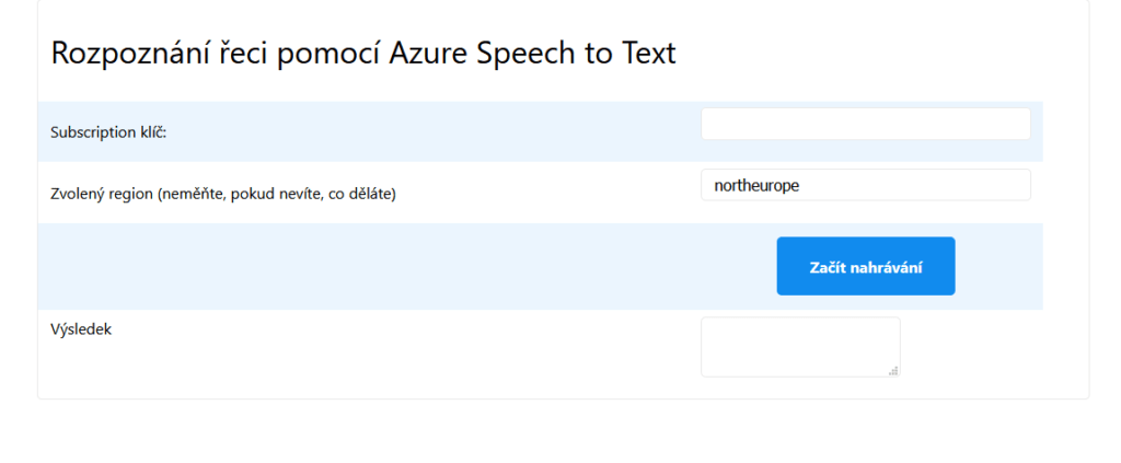 - tlačítko nahrát – <button> s id startRecognizeOnceAsyncButton (budeme ho hledat v JavaScriptu)