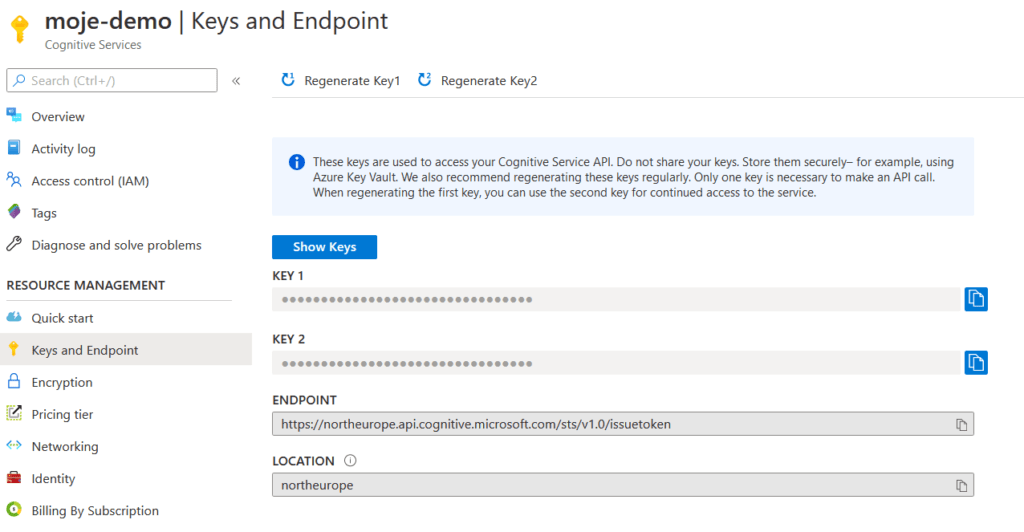 // if we got an authorization token, use the token. Otherwise use the provided subscription key let speechConfig; if (authorizationToken) { speechConfig = SpeechSDK.SpeechConfig.fromAuthorizationToken( authorizationToken, serviceRegion.value ); } else { if ( subscriptionKey.value === "" || subscriptionKey.value === "subscription" ) { alert("Zadejte klíč!"); startRecognizeOnceAsyncButton.disabled = false; return; } speechConfig = SpeechSDK.SpeechConfig.fromSubscription( subscriptionKey.value, serviceRegion.value ); }