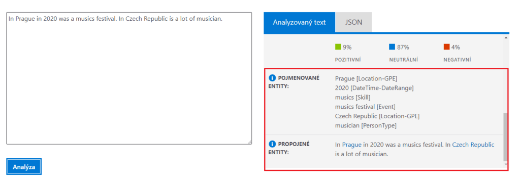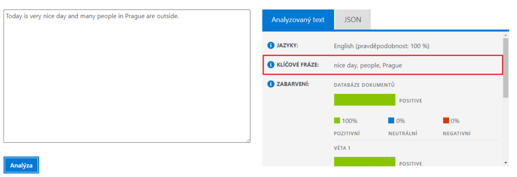 Když například užijete jako vstupní text „Today is very nice day and many people in Prague are outside,“ což v českém jazyce znamená: „Dnes je velmi hezký den a hodně lidí v Praze je venku,“ vrátí vám služba hlavní body: nice day (hezký den), people (lidé) a Prague (Praha). Na obrázku vidíte výsledek vykonaný touto funkcí.