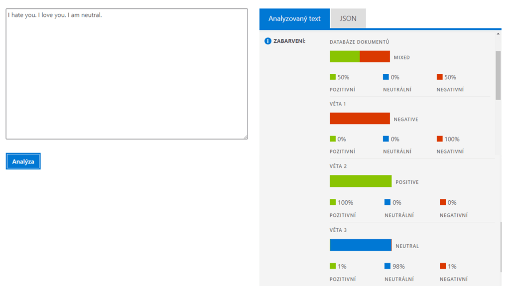 Služba vám určí skóre mínění pro celý dokument, ale i pro každou větu zvlášť. Na obrázku se můžete podívat, jak tyto výsledky vypadají.