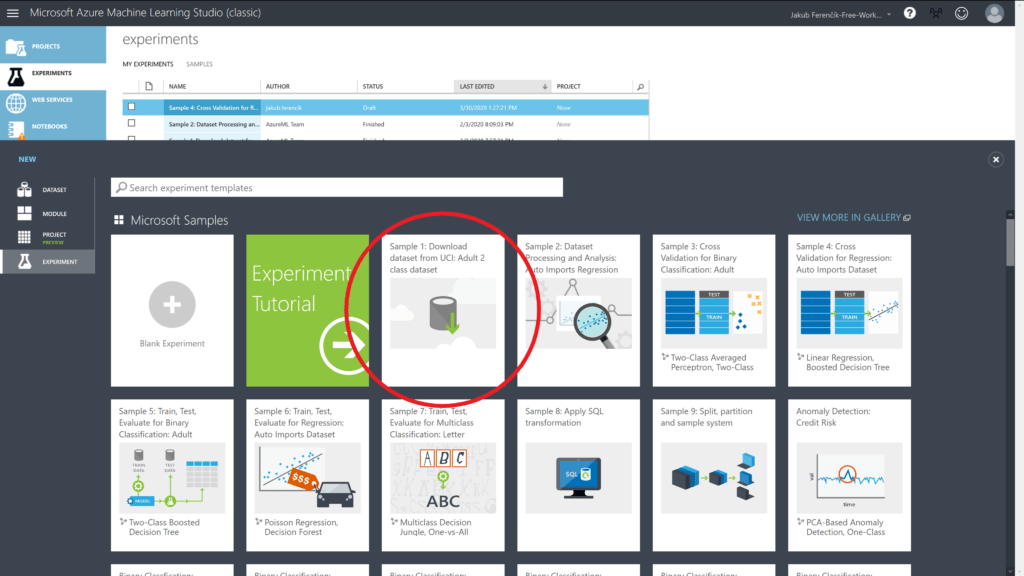 Spustíme si naše Microsoft Azure Machine Learning Studio (dále jen MLS), přihlásíme se a založíme nový experiment z šablon Microsoftu nesoucí název "Sample 1: Download dataset…"