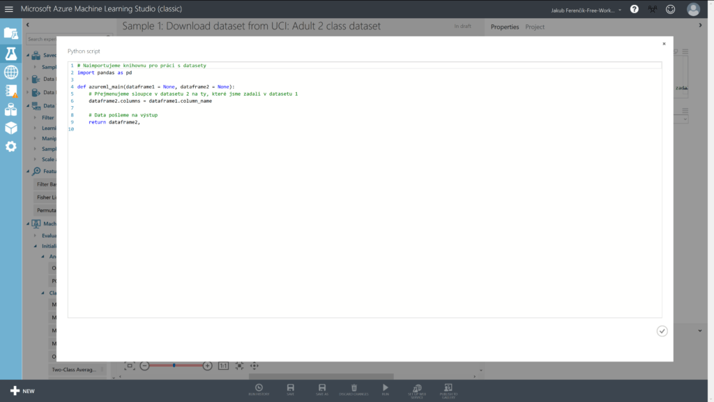 # Naimportujeme knihovnu pro práci s datasety import pandas as pd def azureml_main(dataframe1 = None, dataframe2 = None): # Přejmenujeme sloupce v datasetu 2 na ty, které jsme zadali v datasetu 1 dataframe2.columns = dataframe1.column_name # Data pošleme na výstup return dataframe2,