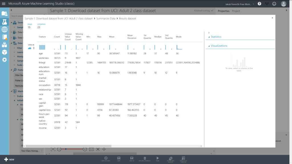 Nyní již stačí experiment jednoduše spustit pomocí tlačítka RUN. Jakmile bude celý proces dokončený, stačí, abychom klikli pravým tlačítkem na položku Summarize Data > Result dataset > Visualise a můžeme si zobrazit základní statistiky a celkovou tabulku s názvy sloupců.