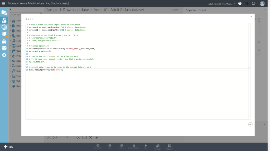 # Do následujících dvou proměnných nadefinujeme, ze kterých portů dostaneme data dataset1 <- maml.mapInputPort(1) # class: data.frame dataset2 <- maml.mapInputPort(2) # class: data.framea # Přejmenujeme sloupce v datasetu 2 na ty, které jsme zadali v datasetu 1 colnames(dataset2) <- c(dataset1['column_name'])$column_name; data.set = dataset2; # Data pošleme na výstup maml.mapOutputPort("data.set");