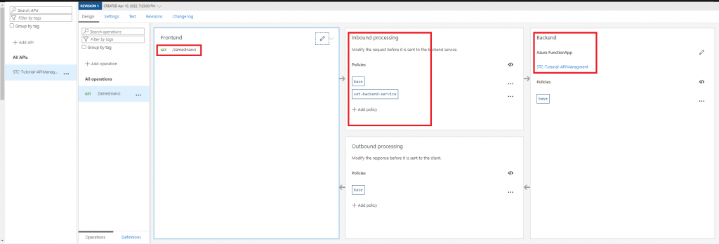 - Inbound processing - zde můžete změnit request předtím než se zpracuje v backendu. Lze přidat Limit call rate, Cache Responses a mnoho dalších.