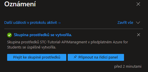 Po vytvoření by Vám opět mělo vyjet oznámení o úspěšném vytvoření. Jako další se vrátíme zpět do skupiny prostředků, a dle tohoto článku si vytvoříte novou Azure Function.