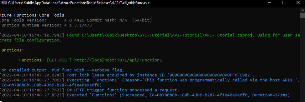Pokud jste udělali vše správně, vytvořený projekt by měl vypadat následovně. Můžete si vyzkoušet funkčnost. Pomocí klávesy F5 spustíte program, a měla by Vám vyjet konzole ve které uvidíte následující informace. Pokud otevřete uvedený localhost, měli by jste vidět text napsaný z již hotového kódu.
