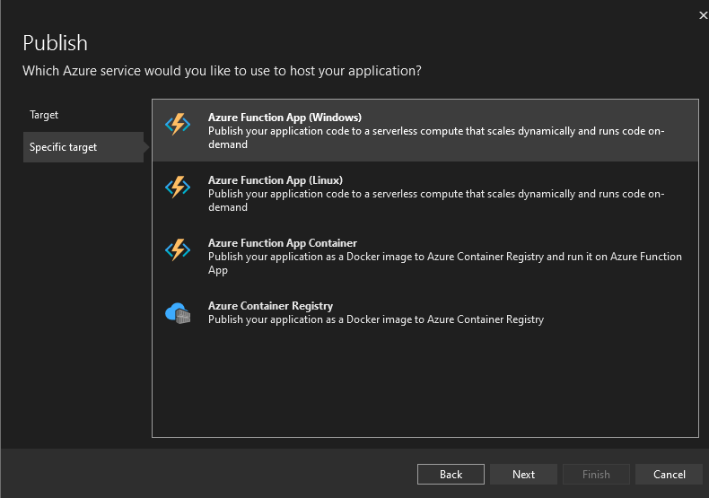 Vyberete Azure, následně Azure Function App (Windows), a vyberete vaší Resource Group (skupinu prostředků) a dáte Publish. Pokud se vše povedlo, měli byste vidět Publish succeeded.