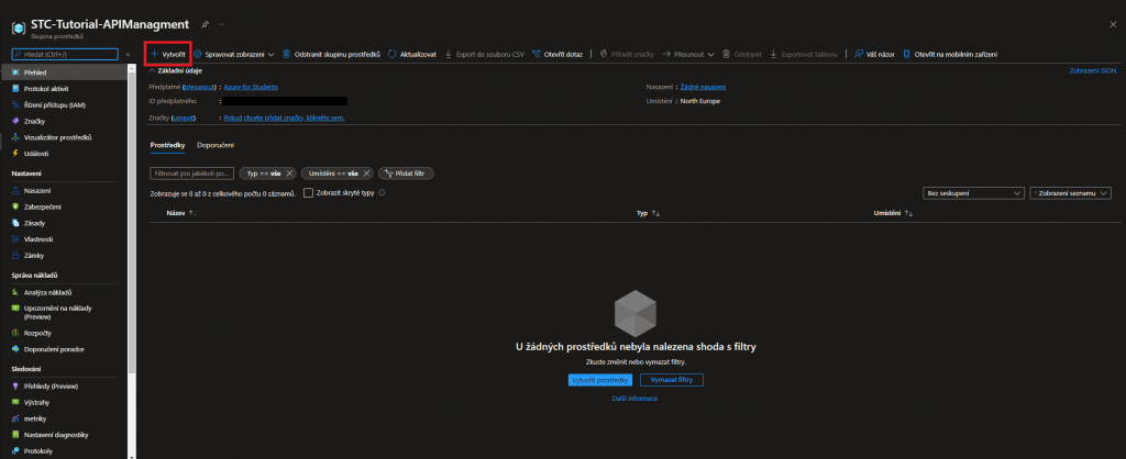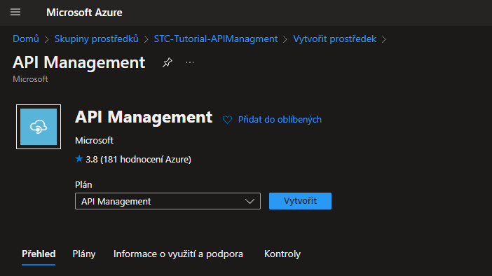 Do vyhledávání zadáte "API Managment" a kliknete na vytvořit.
