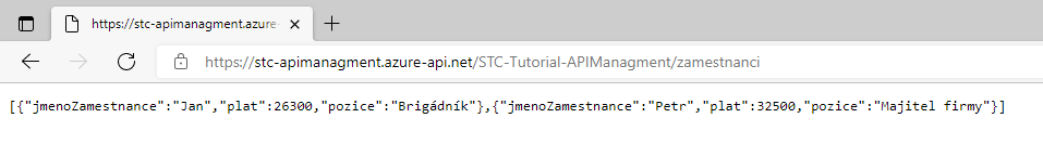 Pokud jste vše správně nastavili, pokud se teď podíváte na první stránku, kterou lze vidět v nastavení API, měli byste vidět výstup z našeho backendu. Nezapomeňte na to, že pokud máte nastavené Subscription Needed, stránka Vám ukáže status code 401, neboť potřebujete poslat s requestem také klíč.