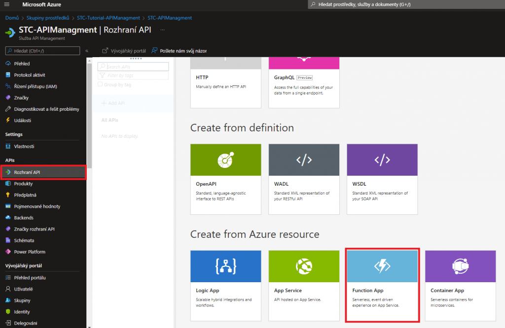 Nyní, když máte vytvořený backend pro naší API, ji můžete konečně vytvořit. Najedete na vytvořený API Managment, kliknete na levém panelu Rozhraní API a vytvoříte novou z Function App.