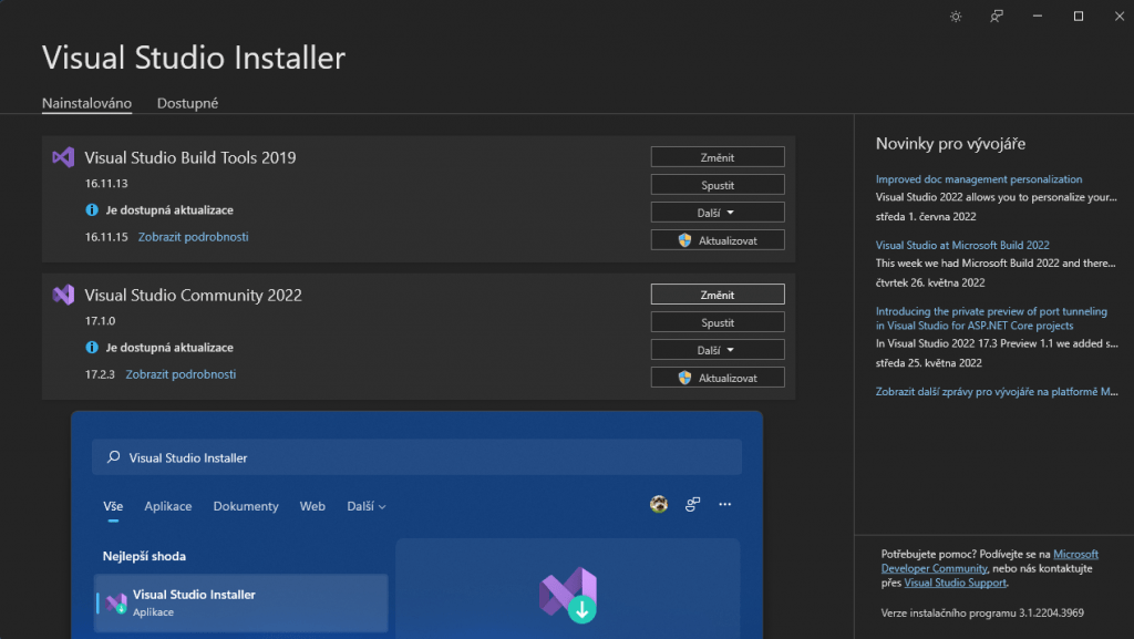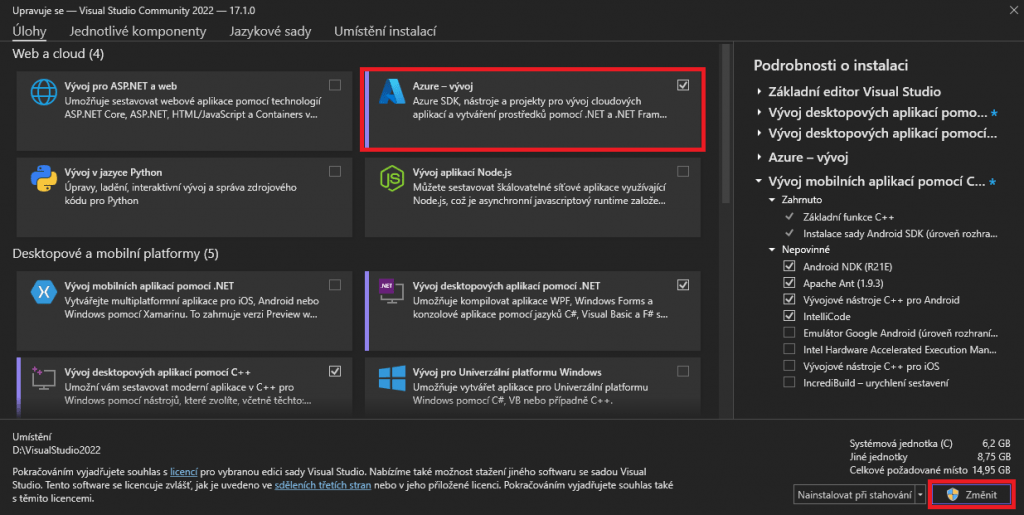 Jestli nemáte na výběr Azure Functions, musíte si jej přidat v installeru. Spustíte program Visual Studio Installer a kliknete na změnit. Následně přidáte Azure – vývoj a kliknete na změnit.