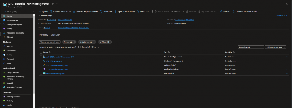 Pokud jste udělali vše správně, měli byste ve vaší skupině prostředků vidět následující služby. Jak si můžete všimnout, vytvořily se nám automaticky ještě nové prostředky.