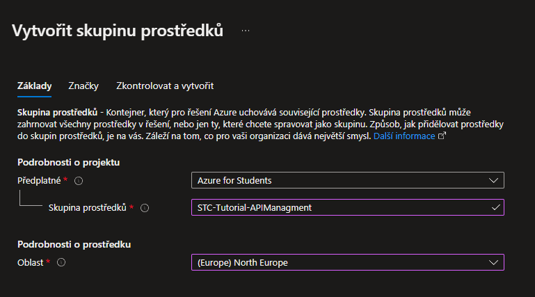Vyplníte podrobnosti o projektu – vyberete předplatné, pojmenujete Skupinu prostředků a vyberete oblast. Až budete mít všechno vyplněné, dole kliknete na Zkontrolovat a vytvořit a skupina prostředků by se Vám měla úspěšně vytvořit. Ověřit si to můžete tak, že vpravo nahoře by Vám mělo vyskočit oznámení o úspěšném vytvoření.