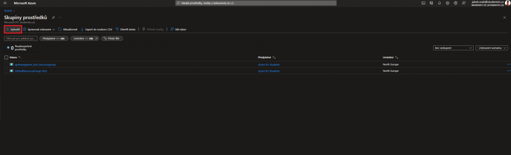 Otevřete si Azure portál, na hlavní stránce Azure si kliknete na Skupiny prostředků a vytvoříte novou.