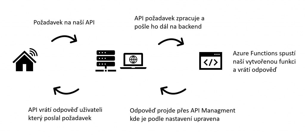 API (Application Programming Interface) je rozhraní pro programování aplikací. Používá se především pro komunikaci mezi programy. V našem případě budeme používat Azure Functions jako backend (logika naší aplikace), API Managment pro správu celé API a její testování. Na níže uvedeném obrázku můžete vidět schéma tohoto projektu.