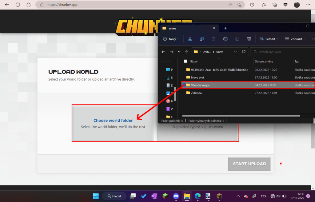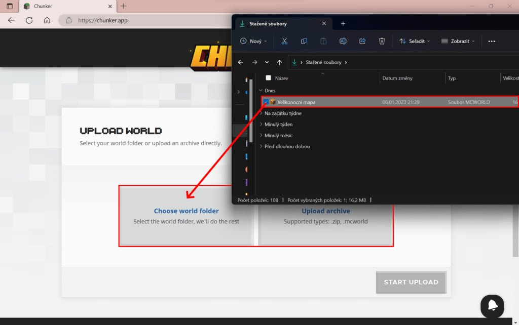 Stejně jako u předešlých kroků se potřebuješ přesunout na stránku Chunker.app, kam svět nahraješ. Jsou dvě možnosti, jak svět nahrát. Můžeme ho jednoduše přetáhnout do dvou boxů nebo svět nahrát přes průzkumníka souborů. Jakmile je svět připravený, klikneme na tlačítko Start Upload.