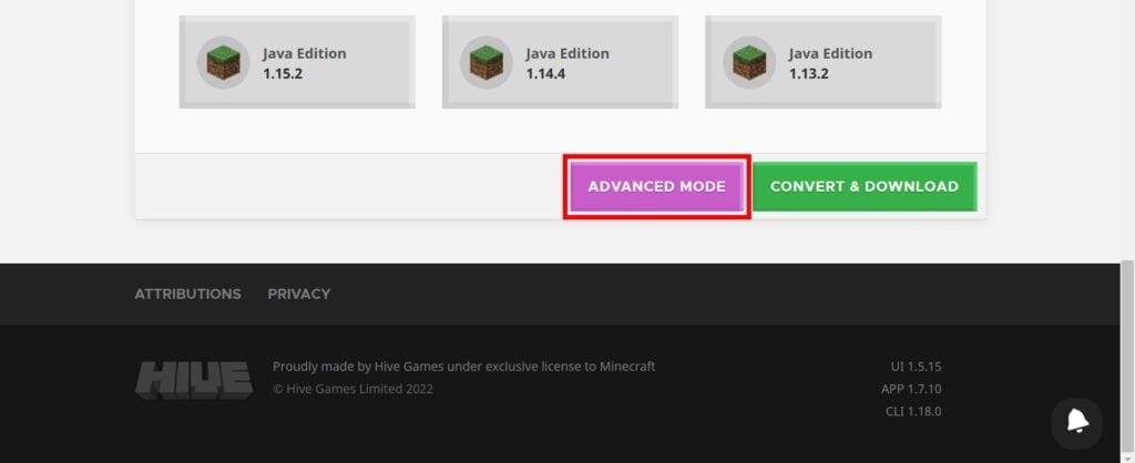 Zvolíme verzi, do které bychom chtěli svět převést. Jakmile máme zvolenou verzi, dole na stránce klikneme na růžové tlačítko Advanced Mode.