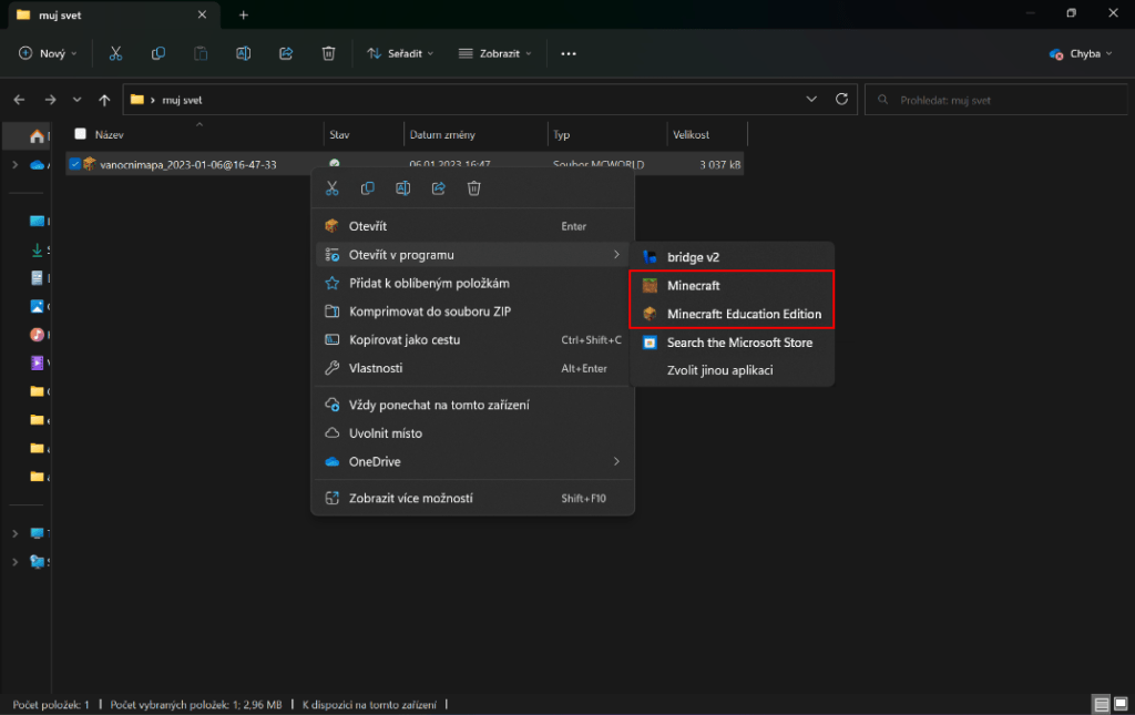 Stažený svět uložíme kamkoliv, třeba na plochu anebo do stažených souborů. Na svět klikneme pravým tlačítkem, rozbalíme Otevřít v programu a vybereme si, v čem svět spustíme. Počkáme, až se Minecraft spustí a máme hotovo.