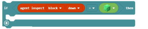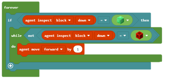 Když tuto funkci spojíte se smyčkou forever, získáme robůtka, který se neustále pohybuje kupředu. To vám ale zdaleka nestačí. Vy potřebujeme, aby Agent věděl kde začít a kde skončit svůj běh. Na to použijete funkci Agent inspect down = a určíte si blok, který chcete identifikovat. Pro vás třeba bude blok ruditu (redstone block) místo, kde zastaví a blok smaragdu (emerald blok) místo, kde začne. Za pomocí funkce if, pak můžeme vytvořit podmínku znějící: „pokud agent detekuje <určitý blok> pod sebou, vykonej <akci>”.
