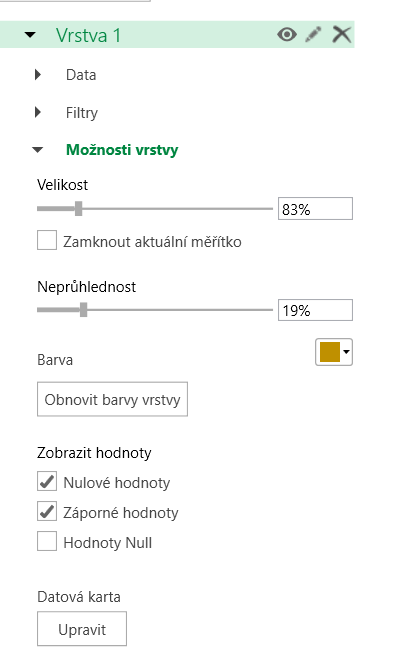 Tento filtr slouží k vizuální úpravě mapy. Zde volíme velikost vrstvy, její barvu a průhlednost. Navolit lze také, jestli chceme zobrazovat záporné, nulové nebo Null hodnoty.