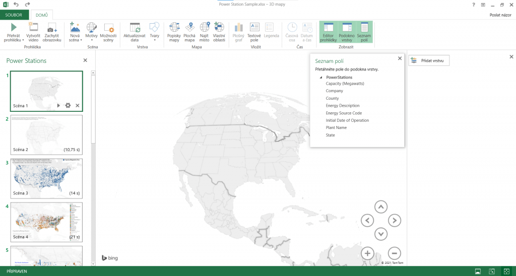 Nejlépe se s 3D mapami naučíme pracovat přímo v programu. Na působivé vizualizace potřebujeme dostatek dat, ze kterých mapu vytvoříme. Buď si takový soubor můžeme připravit sami, nebo si práci usnadníme a najdeme si odpovídající data na internetu, například ve formě csv nebo přímo excelového souboru. Na stránkách podpory Microsoftu máme k dispozici vzorových datových sad hned několik, také včetně podrobného návodu. Jednou z dostupných sad je sada Elektrárny, kterou jsme použili jako příklad v tomto článku.