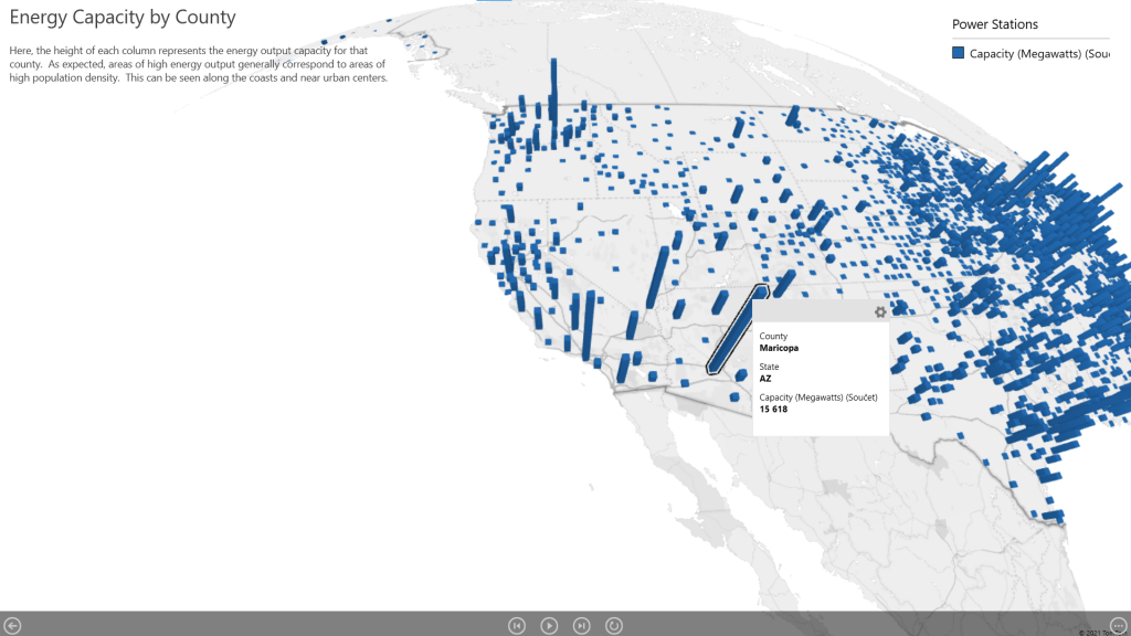 Prvních pět ikonek nám umožňuje vybrat si mezi typem grafů. Na výběr máme skládaný nebo skupinový sloupcový graf, dále bublinový graf, heat mapu nebo podbarvení celé oblasti. Pod těmito ikonkami se nachází kategorie Umístění. Nejprve zkontrolujeme, zda data mají odpovídající vlastnosti. S tím nám může pomoci procentuální vyjádření u kategorie. Čím vyšší číslo je, tím přesněji se programu podařilo data mapovat. To, co bude 3D mapa ukazovat, můžeme ovlivnit zadáváním patřičných hodnot do kolonek Umístění, Velikost, Kategorie a Čas. Pro ukázku jsme do kategorie Čas zařadili Initial Date of Operation (počáteční datum provozu). Jako výsledek vznikla animace znázorňující uvedení jednotlivých amerických elektráren do provozu v průběhu let 1900 až 2008.