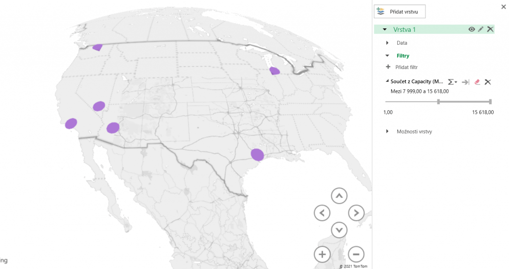 Pomocí filtrů se můžeme rychle zbavit hodnot, které nás nezajímají. Jako příklad jsme si zvolili, že chceme vidět pouze elektrárny s kapacitou větší než je 7 999 MW.