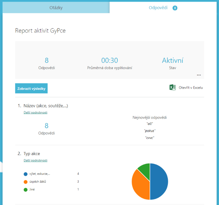 U jednotlivých otázek také nezapomeňte nastavit, zda si přejete, aby byly povinné, a jestli se má zobrazovat bublina na krátkou, či dlouhou odpověď. Pro zobrazení odpovědí přejděte ve formuláři na Odpovědi a zvolte možnost Otevřít v Excelu. Následně se dostanete k sešitu, do kterého se Vám budou v reálném čase vepisovat odpovědi, jež můžete již jednoduše zpracovávat. Ke stejnému sešitu se kdykoli můžete dostat i přes OneDrive. Právě na Vašem OneDrive je totiž po celou dobu uložen, a můžete s ním proto jednoduše dále pracovat nebo ho sdílet se svými kolegy.