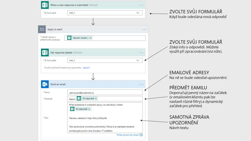Kdybychom si tuto šablonu měli trošku popsat, hodně souvisí se skutečným programováním. Na začátku všeho je tzv. událost, tedy vyvolávací akce, kterou je v našem případě „Když bude odeslána nová odpověď“ („When a new response is submitted“). Na tuto událost reagujeme bloky „Získat podrobnosti o odpovědi“ („Get response details“), kde jen zadáváme ID formuláře, aby Power Automate věděl, ze kterého formuláře je chceme získat, a „Odeslat e-mail“ („Send an email“), v němž vyplňujeme příjemce, předmět a text. Všimněte si, že například v předmětu a textu lze používat i proměnné, tedy pole z formuláře.